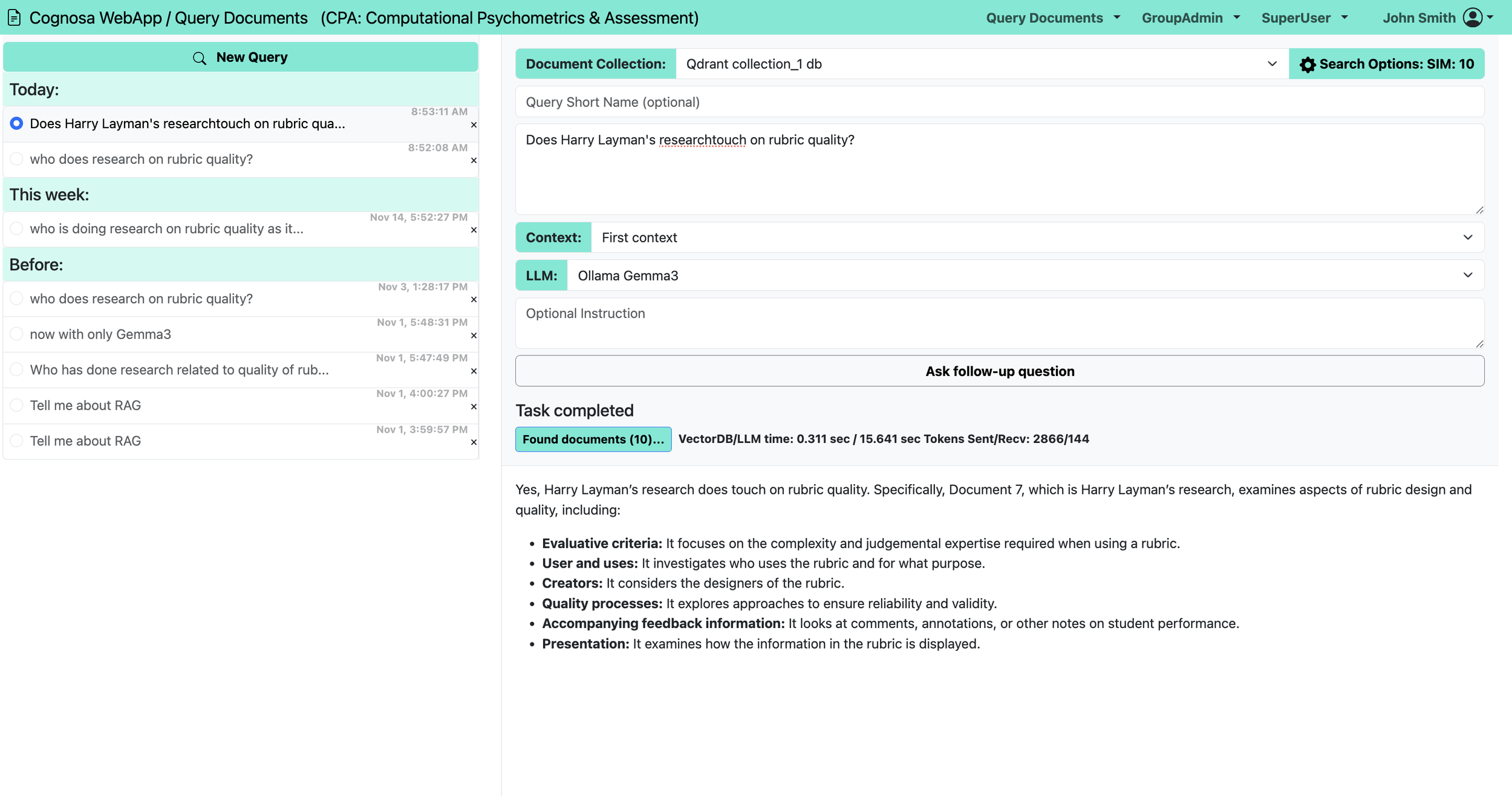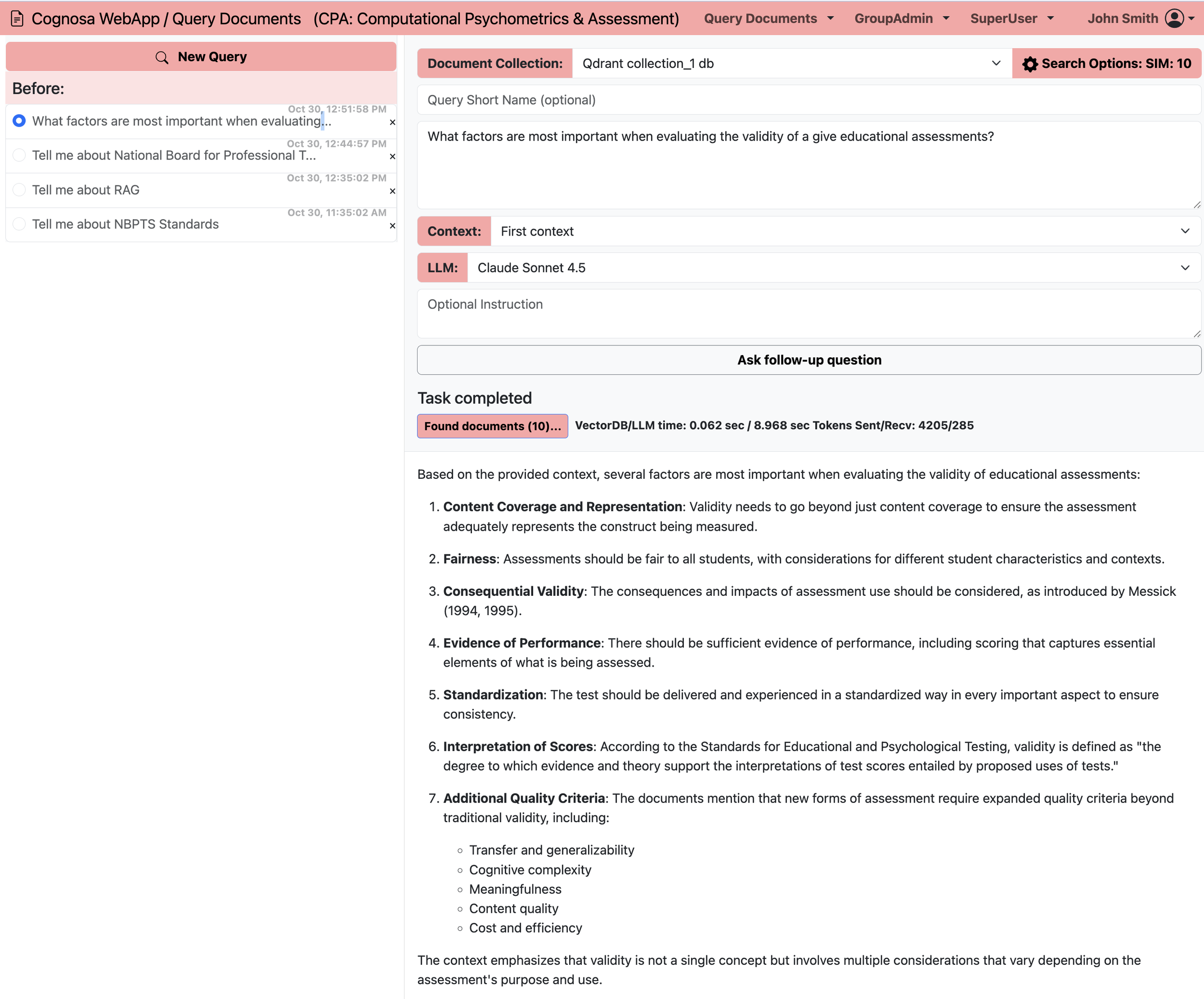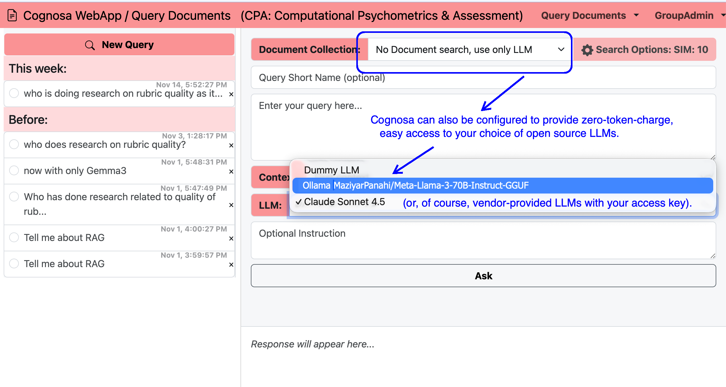 Organizations often maintain multiple data collections: industry research, regulatory guidance, internal policies, customer service resources, product documentation, and more. Cognosa can connect any or all of these collections to an LLM, giving users precise, context‑rich answers. In the example shown, this Cognosa workspace offers access to an open‑source Llama‑3 70B model (optimized for accuracy and speed) or Anthropic’s Claude 4.5 Sonnet model. Queries sent to Claude generate charges directly to the customer’s Claude API account, while Cognosa saves and logs all queries and responses for later review.